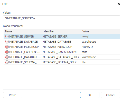 On setting up database properties, you can use global variables in the Server and Schema/Database fields. By default, the Server drop-down list contains the %METABASE_SERVER% variable, and the Schema/Database menu contains the %METABASE_DATABASE% variable. To select or edit another variable, click the Edit item in the drop-down list. Value editing dialog box opens: