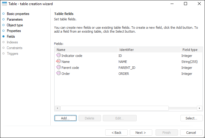 On the Table Fields page of the table creation wizard determine the structure of the table to create, that is, the list of table fields and their properties is created.