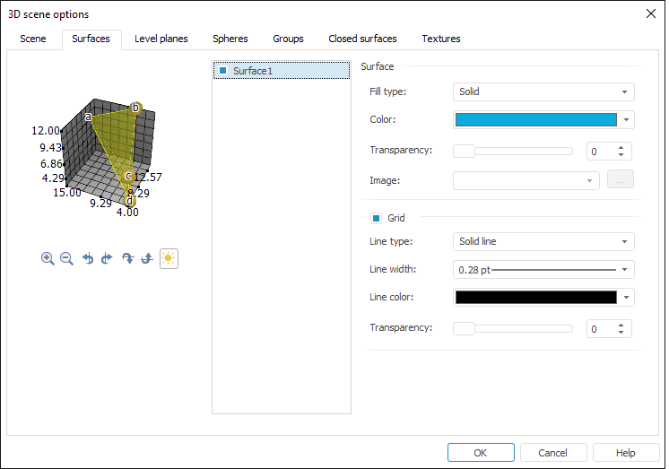 To set up surface parameters, go to the Surfaces tab of the 3D Scene Options dialog box: