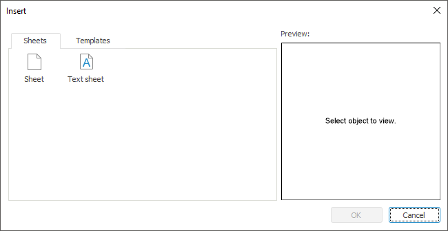 Select Text Sheet on the Sheets tab of the Insert window. A text sheet is added.
