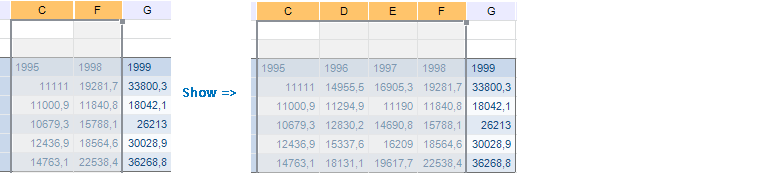 If several hidden columns are positioned between the selected columns, the Show command shows all the hidden columns.