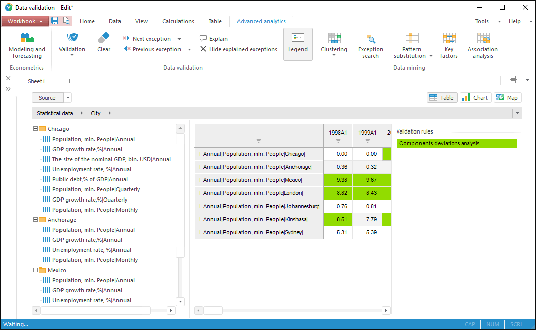 On executing validation rule highlights exceptions. Exceptions are observations or time series not corresponding to the validation rule conditions.