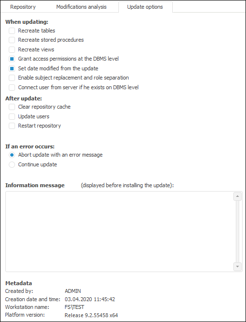 Security Subject. The operation is required on transfer of single users between repositories. Select the checkbox for correct transfer of users to database server. In this case, when the update is installed, a new user is not created if he already exists on the server. If the checkbox is not installed, a new user is created on the server. If this user already exists, the corresponding error message is displayed.