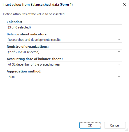 Aggregation Method. The parameter is available if multiple element selection is set in one of the dimensions. Select one of value aggregation methods. Available aggregation methods: sum, minimum, maximum, number of non-empty, number of empty, number of all children, average, actual mean, first actual, last actual, root-mean square deviation based on sample, median, root-mean-square-deviation, number of different values.