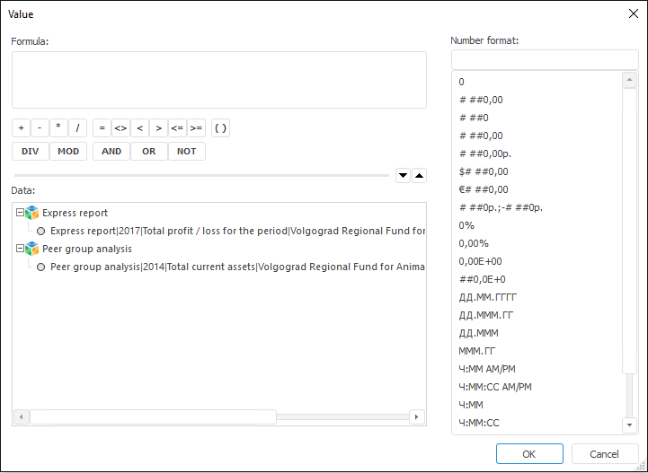 Formula. The area is used to create a formula for calculating an expression. Any arithmetic operations, numbers, signs of comparison and round brackets can be used in a formula. It is available to create an expression by typing required symbols on keyboard, using data area and corresponding operator buttons.