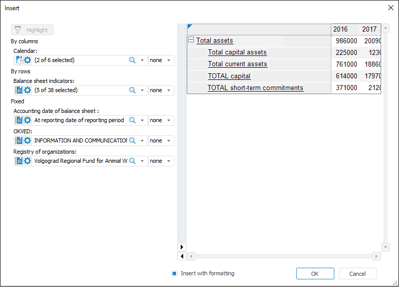 Formatting. To apply table formatting from data source, select the Insert with Formatting checkbox. If the checkbox is deselected, data source formatting settings are not applied to the table.