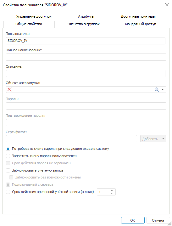 выберите пользователя и выполните команду главного меню «Пользователь > Свойства»;
