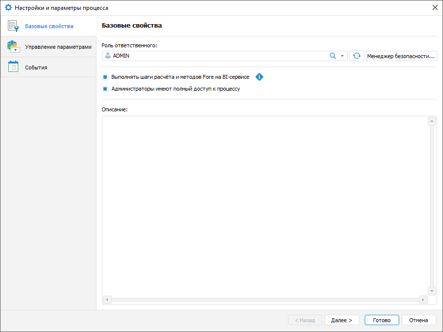Построение процесса | Настройка базовых свойств | Управление параметрами | Настройка событий