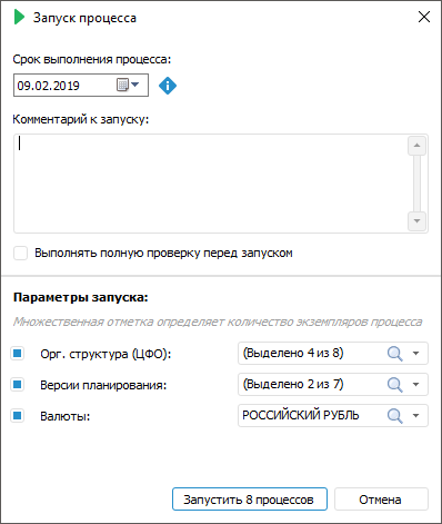 На приведенном выше примере отмечены параметры «Организационная структура» (4 организации), «Версии планирования» (2 версии планирования) и «Валюты» (1 валюта). Таким образом, количество комбинаций параметров равняется 8 и, соответственно, будет запущено 8 экземпляров процесса для каждой комбинации параметров. Если флажок снят, то значение неотмеченного параметра будет выбираться из списка при выполнении шага.
