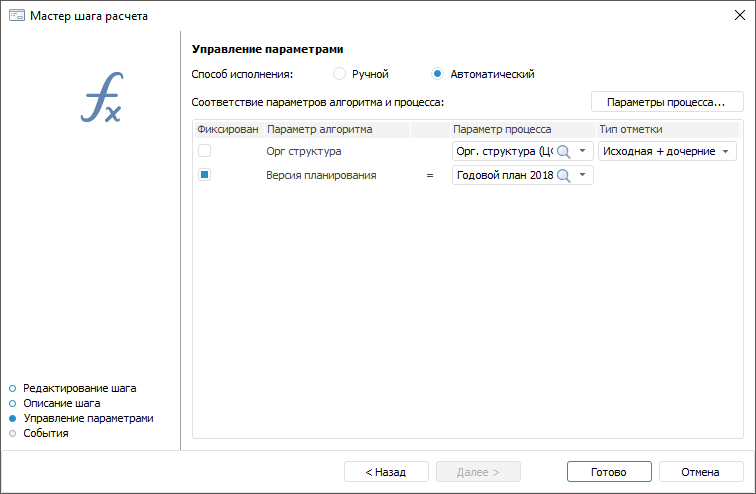 В приведенном примере алгоритм расчёта будет запускаться с фиксированным значением параметра «Версия планирования»: «Годовой план 2018». Для фиксированных значений параметра тип отметки не выбирается.