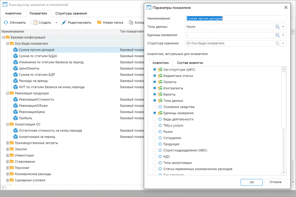 Конструктор аналитик и показателей предназначен для настройки параметров аналитик и показателей, входящих в состав бюджетной модели.