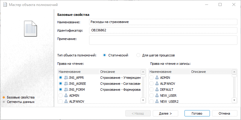 Мастер объектов полномочий  служит для предоставления статических и динамических прав группам пользователей на сегменты бюджетных показателей.