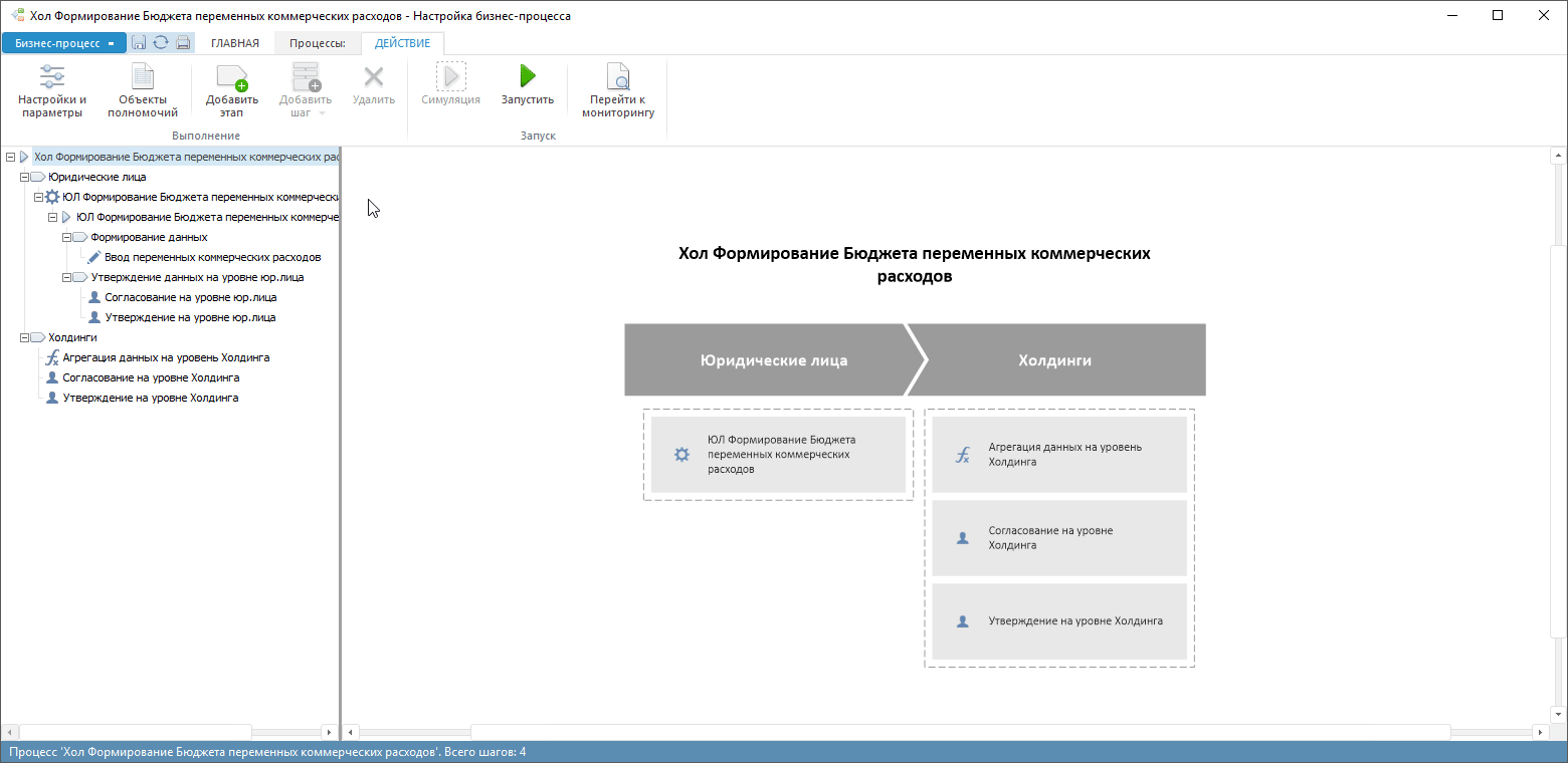 Для этапа «Юридические лица» создайте шаг вызова подпроцесса. Для этапа «Холдинги» создайте шаг расчёта для агрегации данных на уровень Холдинга, а также шаги согласования и утверждения данных на уровне Холдинга, аналогично уровню Юридических лиц: