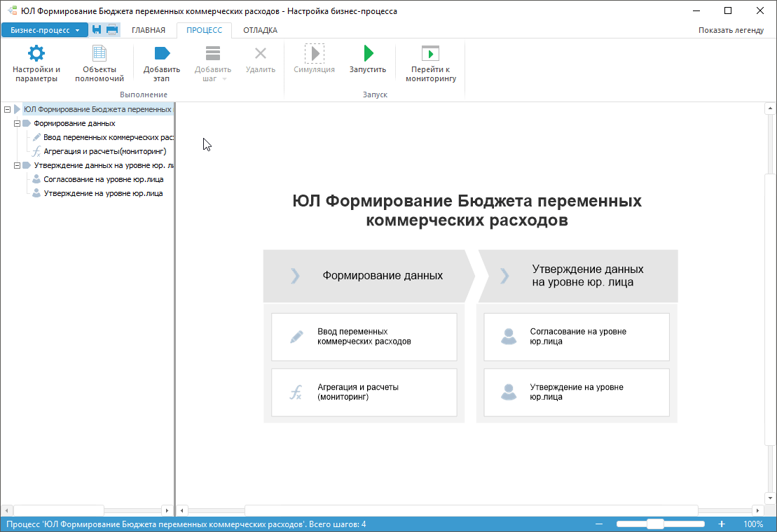 В рамках этапа «Формирование данных» создайте шаг ввода планируемых переменных коммерческих расходов, а для этапа «Утверждение данных на уровне юр.лица» создайте шаги согласования и утверждения данных на уровне Юридических лиц:
