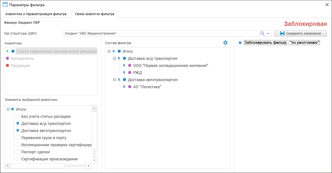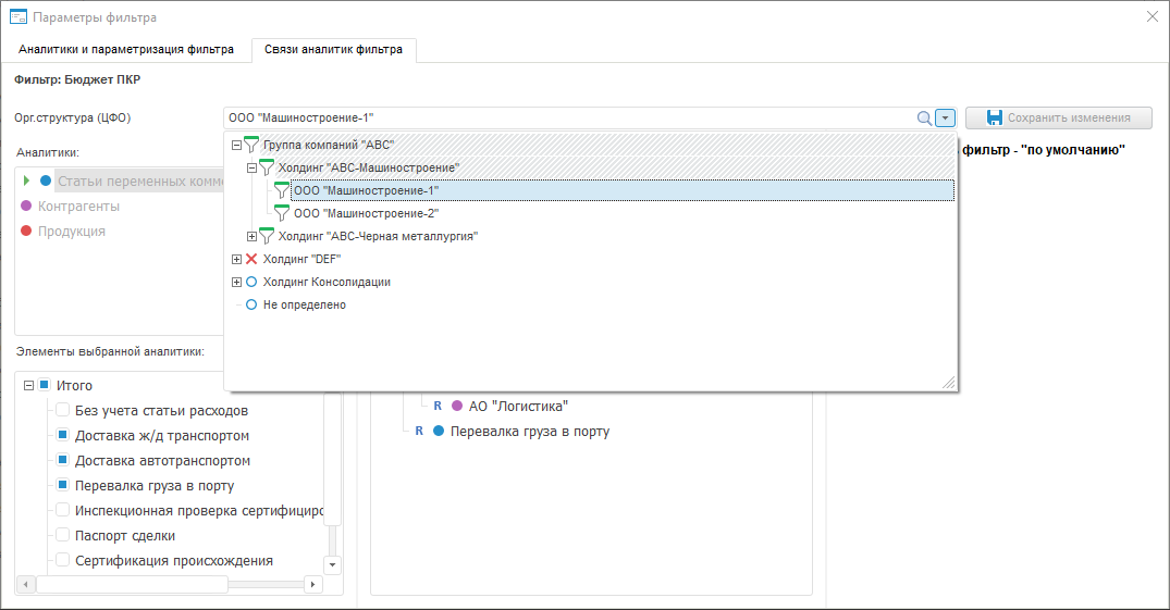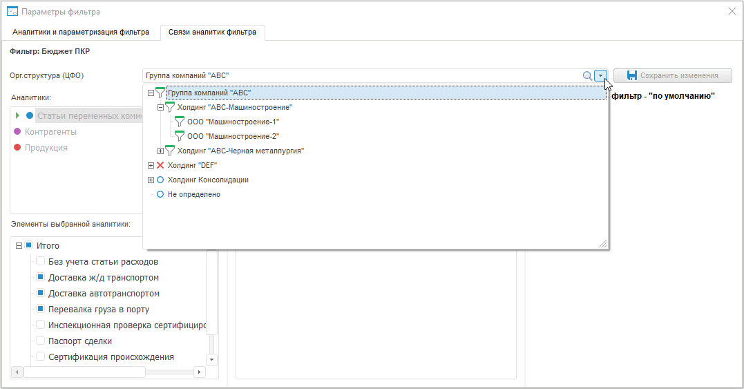 Таким образом, если в качестве основного параметра выбрать аналитику «Орг.структура (ЦФО)», то можно задать различный состав фильтра для разных элементов организационной структуры.