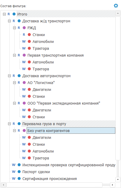 Возможна ситуация, когда для детализации элемента верхнего уровня используются элементы аналитики нижнего уровня, без детализации по промежуточным уровням. В этом случае в структуру фильтра необходимо включить итоговый корневой элемент промежуточного уровня, а затем детализировать его элементами нижнего уровня.