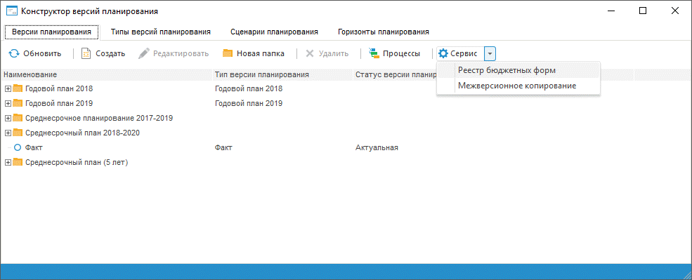 Для начала работы с реестром бюджетных форм откройте конструктор версий планирования.