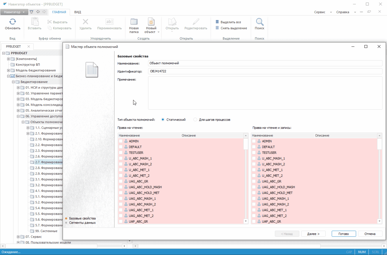 Для создания объектов полномочий используется «Мастер объекта полномочий».