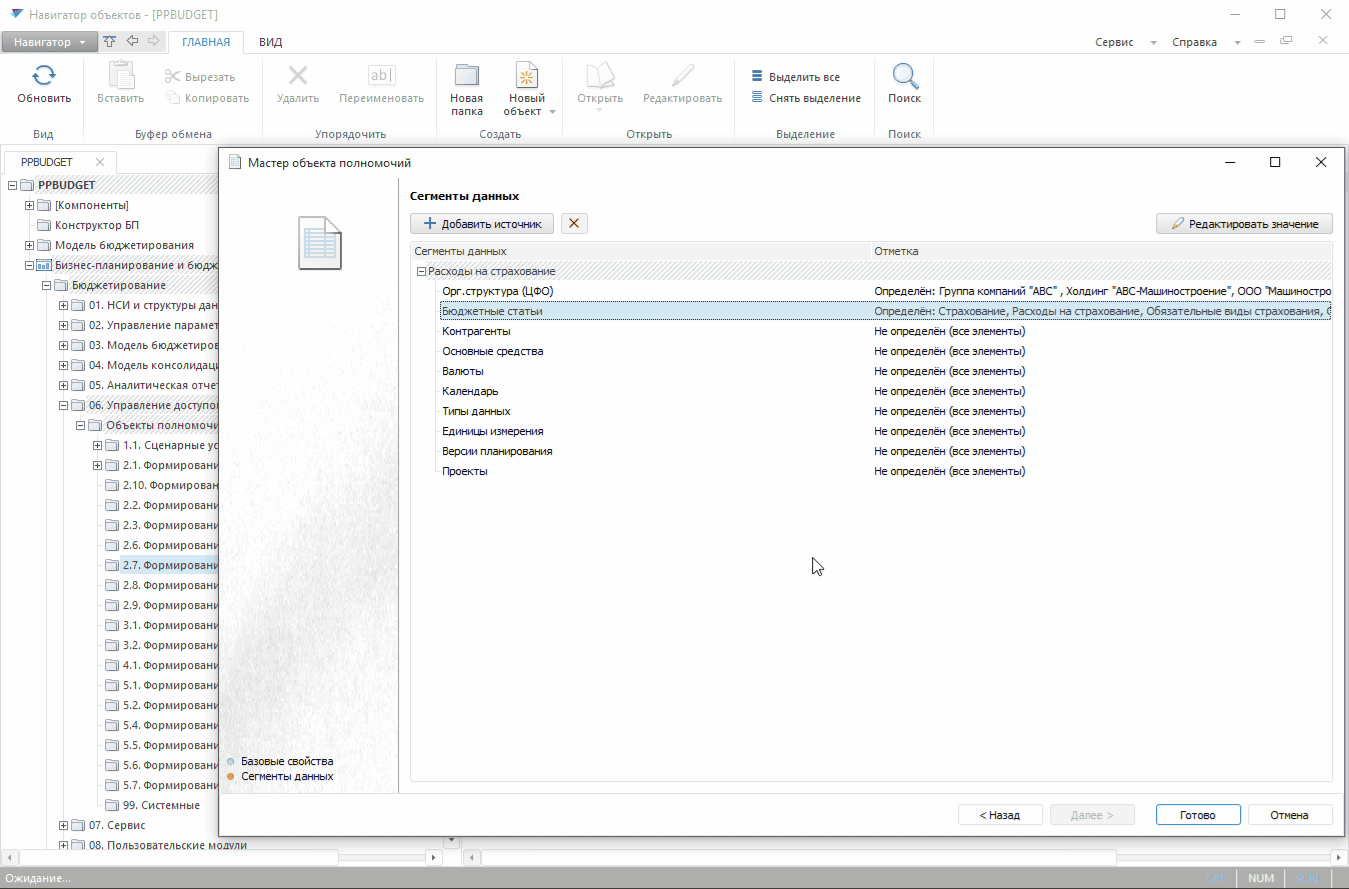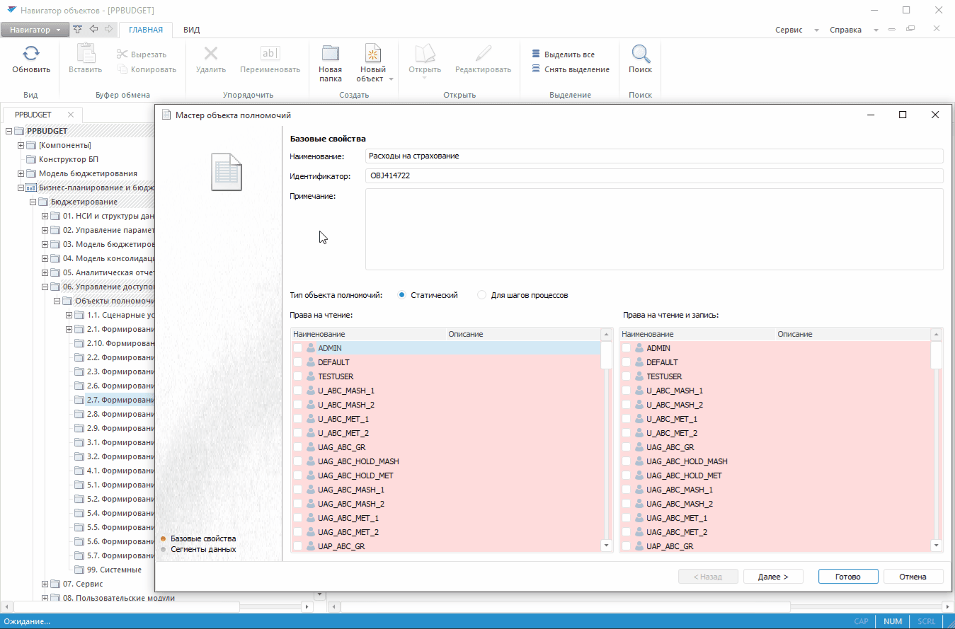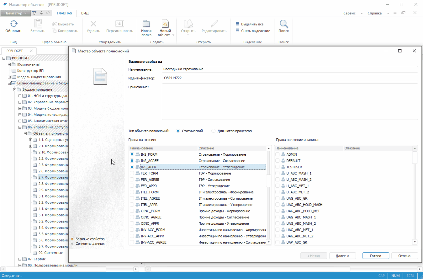 В результате настройки статического объекта полномочий определяются отдельные сегменты данных по бюджету расходов на страхование для отмеченных организаций и бюджетных статей, на которые действуют постоянные права доступа на чтение для трёх функциональных групп, отвечающих за формирование, согласование и утверждение этих данных.