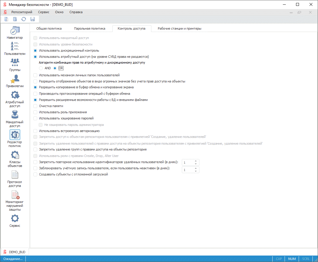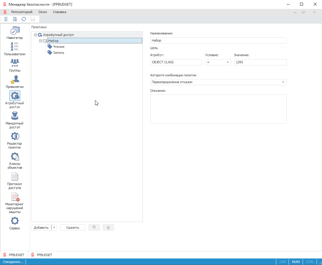 Выбор метода разграничения доступа выполняется в разделе «Редактор политик» инструмента «Менеджер безопасности» продукта «Форсайт. Аналитическая платформа».
