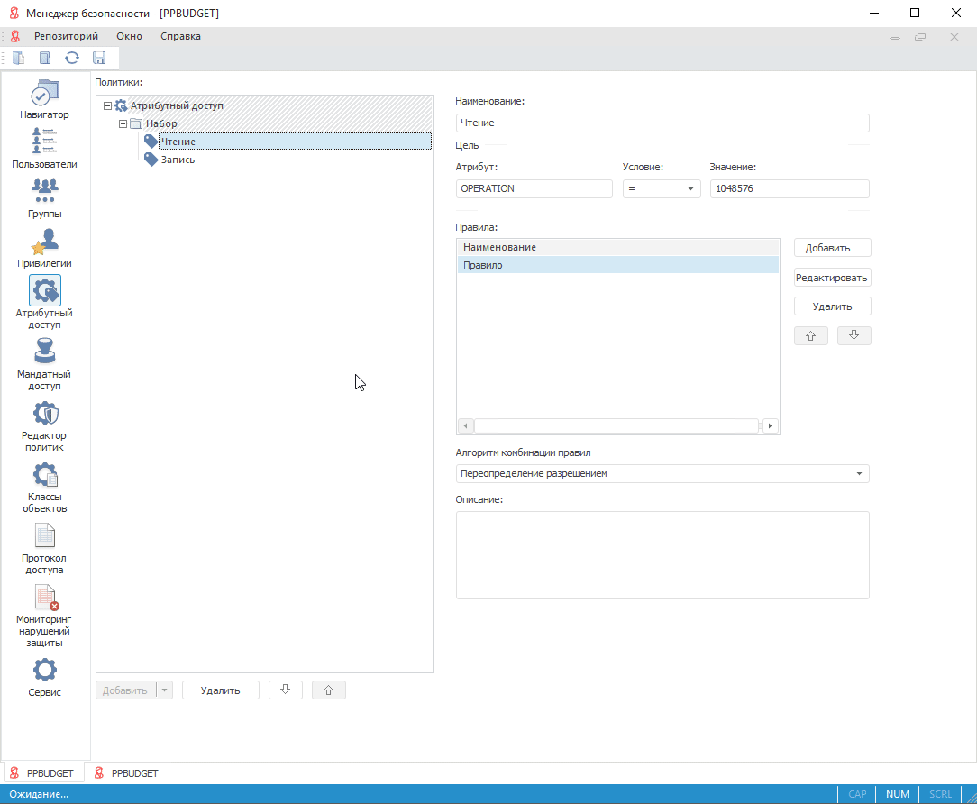 Для правила «Чтение» целевое условие «OPERATION=1048576» определяет действие правила на операцию чтения данных объекта.