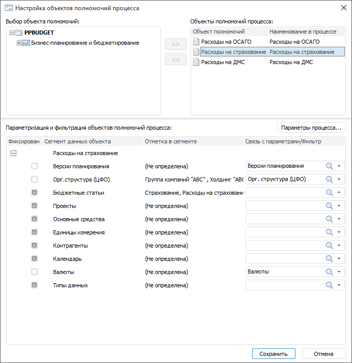 Объект полномочий также связывается с параметрами процесса для ограничения сегмента данных переданными значениями параметров. В данном случае параметрами служат версия планирования, организационная структура и валюта.