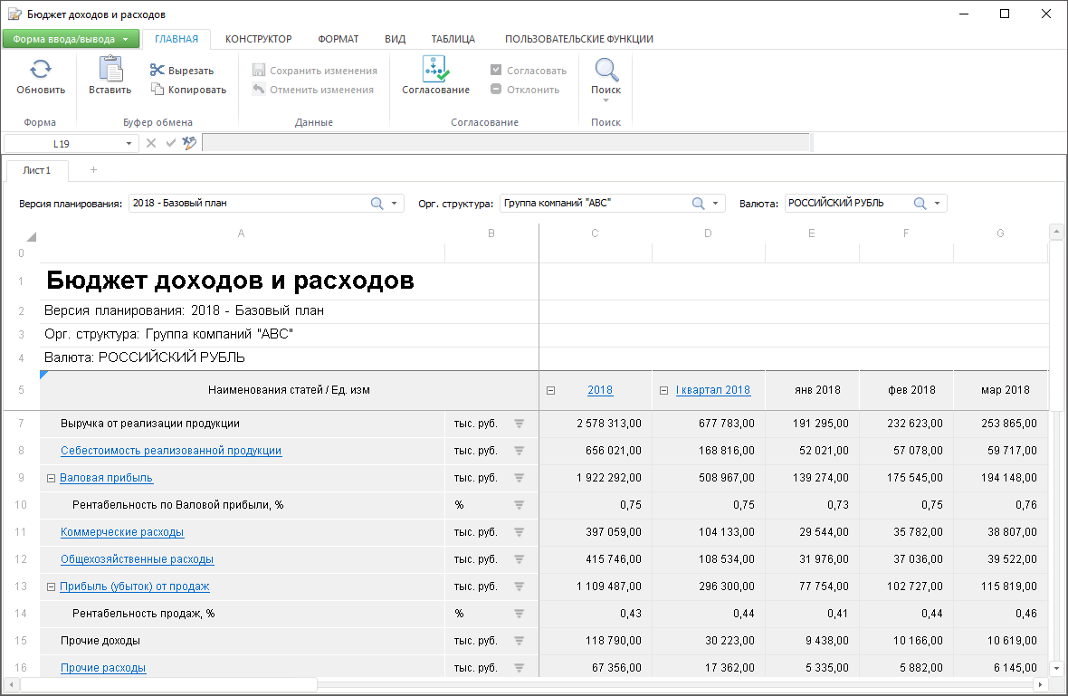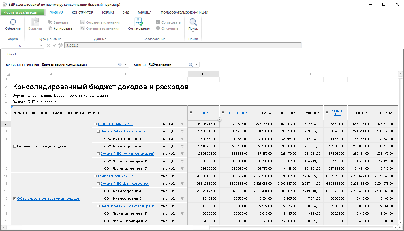 Результат консолидации данных по выбранному периметру консолидации отображается и контролируется в консолидированных бюджетных формах с детализацией по периметру консолидации.