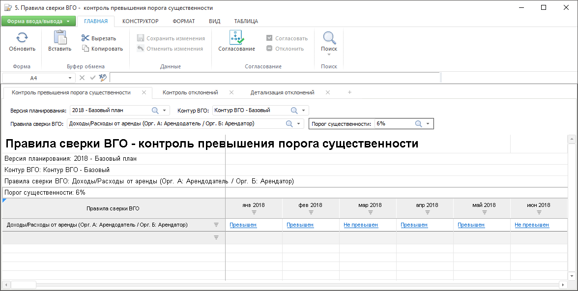 Результат сверки внутригрупповых оборотов отображается и контролируется в служебной форме «Правила сверки ВГО – контроль превышения порога существенности».