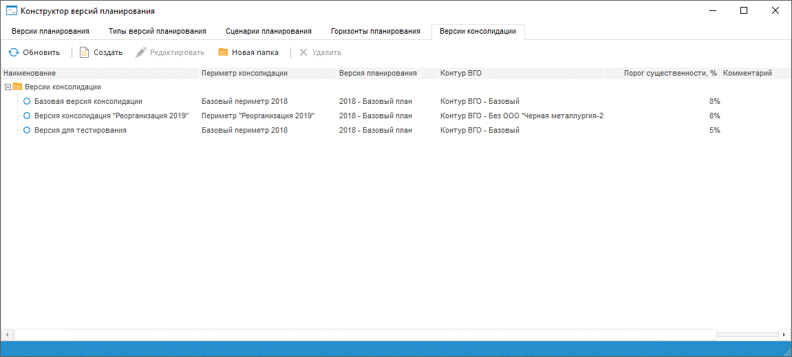 Вид вкладки «Версии консолидации»: