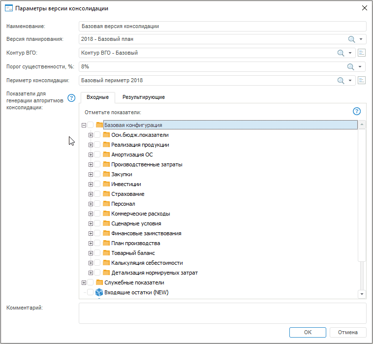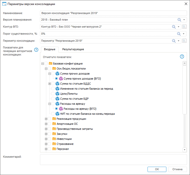 Для входных показателей генерируется алгоритм «Консолидация входных показателей» (с параметром «Версия консолидации»), который: