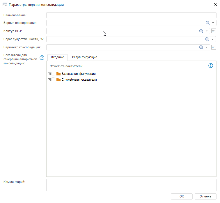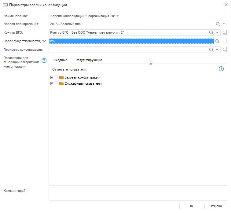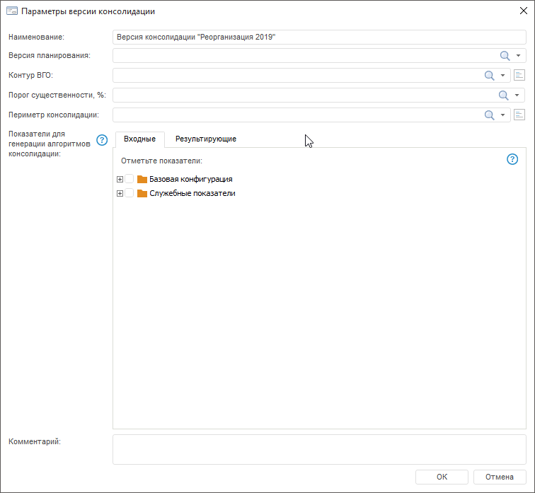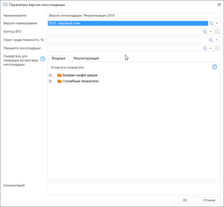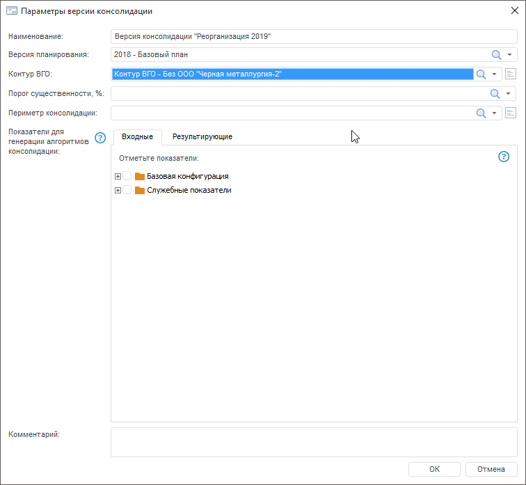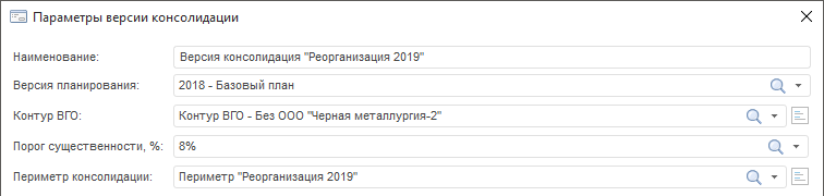 При формировании версий консолидации необходимо обеспечить сопоставимость элементов контура ВГО и периметра консолидации, указанных в соответствующих полях окна «Параметры версии консолидации».
