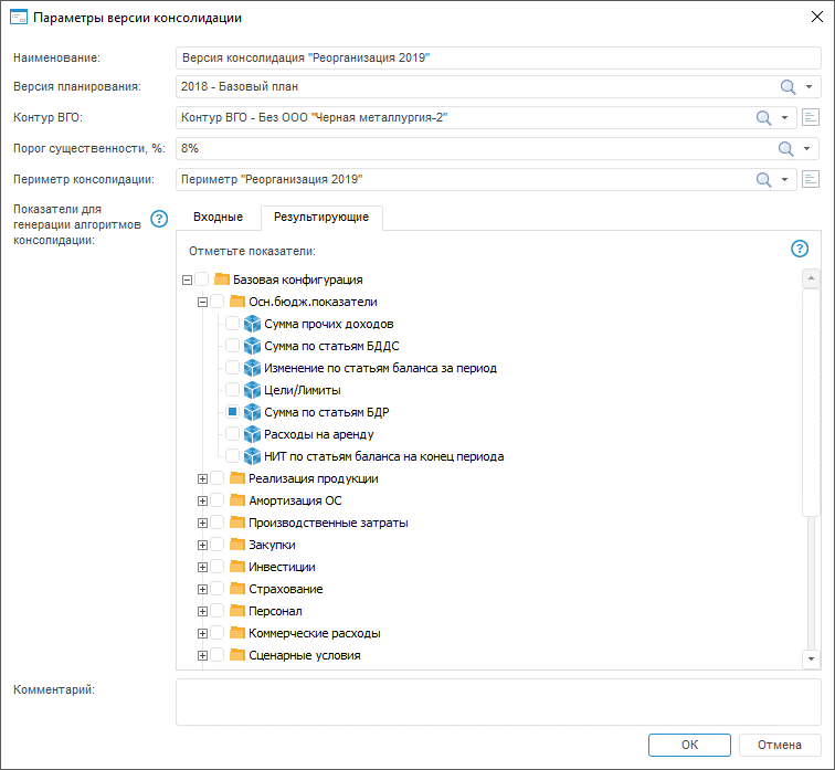 Для результирующих показателей генерируется алгоритм «Консолидация результирующих показателей» (с параметром «Версия консолидации»), который для всех результирующих показателей по версии консолидации выполняет агрегацию «снизу-вверх» по периметру консолидации.