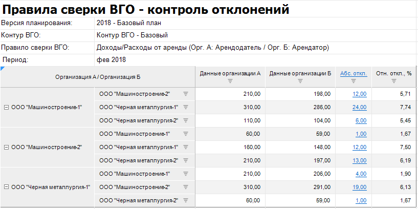 На первом шаге расчёт алгоритма «Сверка ВГО – расчёт отклонений» обеспечивает расчёт абсолютных и относительных отклонений между данными сторон по "встречным" внутригрупповым операциям.
