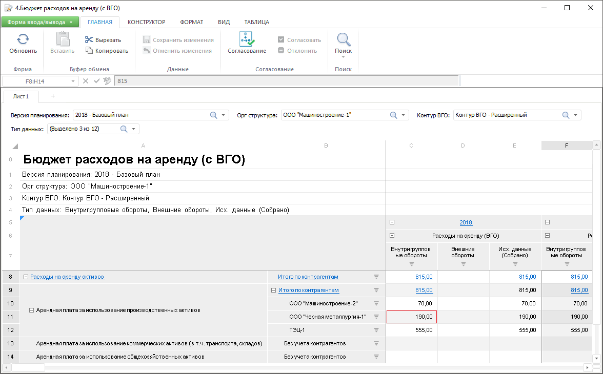 «Бюджет расходов на аренду (с ВГО)», которая содержит данные компаний-арендаторов о расходах на аренду производственных активов – по данным компании-арендатора ООО «Машиностроение-2» её расход в январе 2018 на аренду производственных активов у компании ООО «Машиностроение-1» составил 190 тысяч рублей