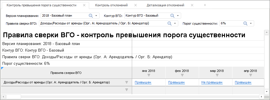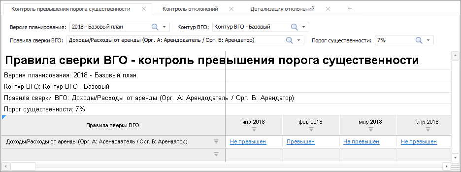 Первый лист формы предназначен для контроля превышения порога существенности. На нем (для заданных версий планирования, контура ВГО и порога существенности) для выбранных правил сверки ВГО по календарным периодам выводится информация о том, были ли для правил выявлены расхождения по «встречным» внутригрупповым операциям, превышающие заданный порог существенности.