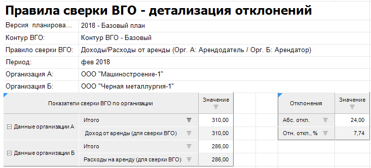 В качестве примера рассмотрим процесс, в рамках которого выполняется выделение и сверка ВГО по показателям двух бюджетных форм – «Бюджет прочих доходов» и «Бюджет аренды».