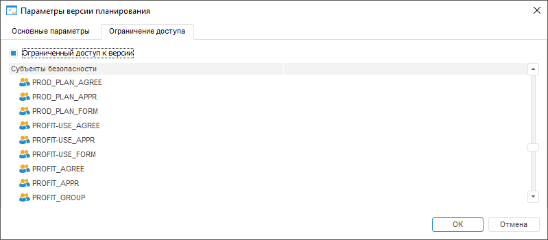 Выберите в области «Субъекты безопасности» только тех пользователей/группы пользователей, которые получат права на доступ к версии планирования.