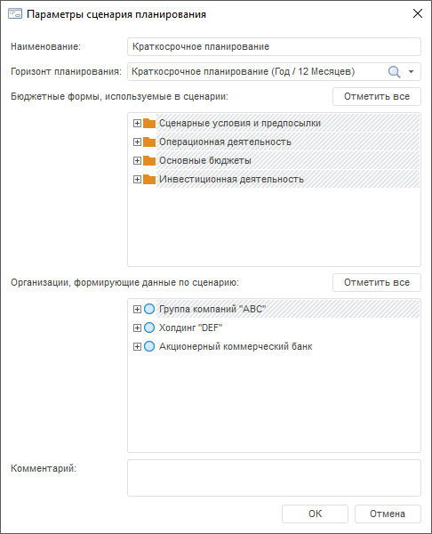 Для сохранения введенных значений параметров сценария планирования нажмите кнопку «OK».