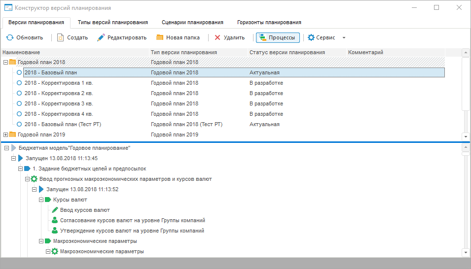 Для работы с версиями планирования используйте вкладку «Версии планирования» конструктора версий планирования.