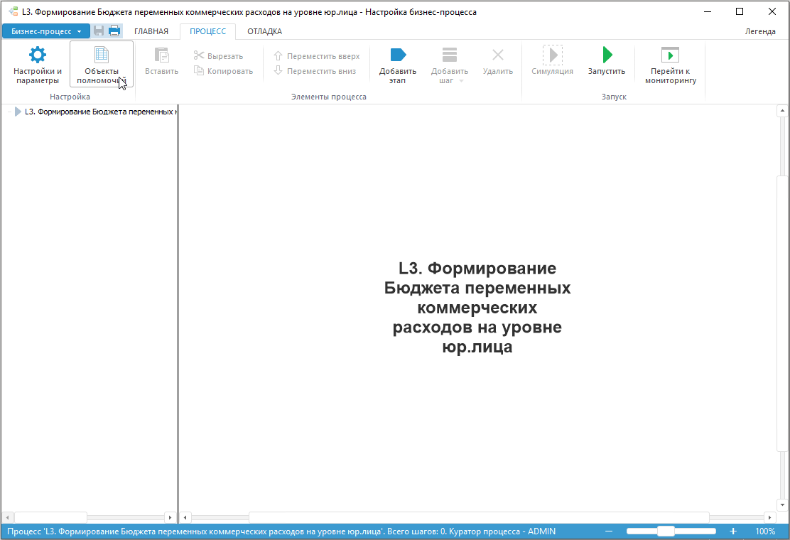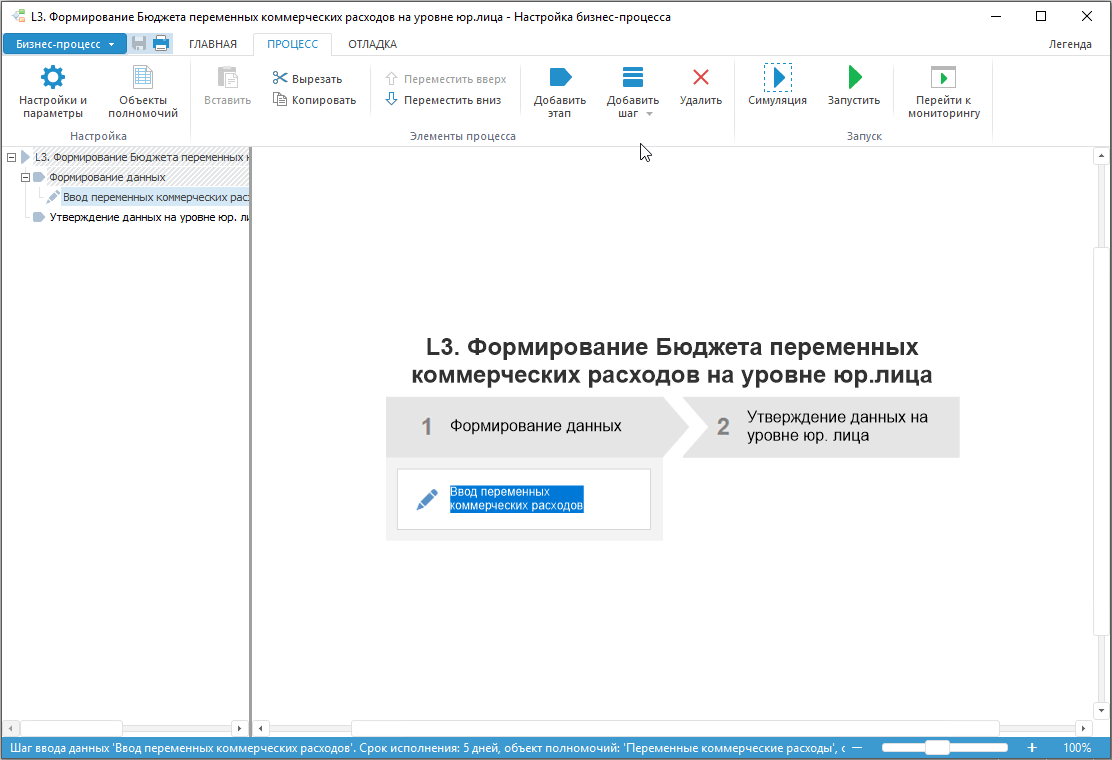 По аналогии с процессом «Формирование Бюджета переменных коммерческих расходов на уровне юридических лиц» настройте параметры процесса и объекты полномочий.