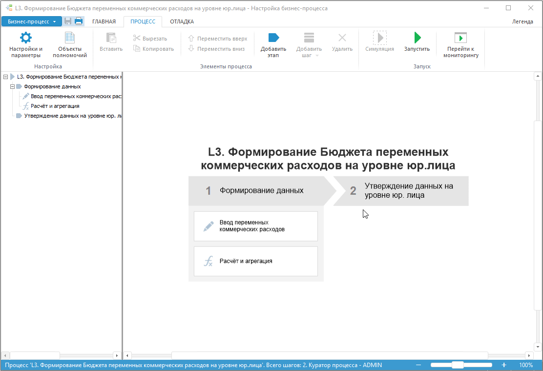 После создания бизнес-процесса для ввода, согласования и утверждения данных по переменным коммерческим расходам на уровне юридических лиц, создайте процесс для уровня холдингов: