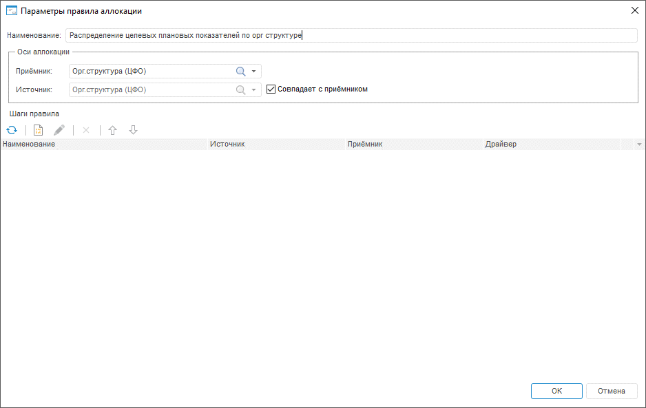 Для настройки осей аллокации последовательно выберите требуемые аналитики в списках «Приёмник» и «Источник». В том случае, если приёмник и источник совпадают, установите флаг «Совпадает с приёмником».