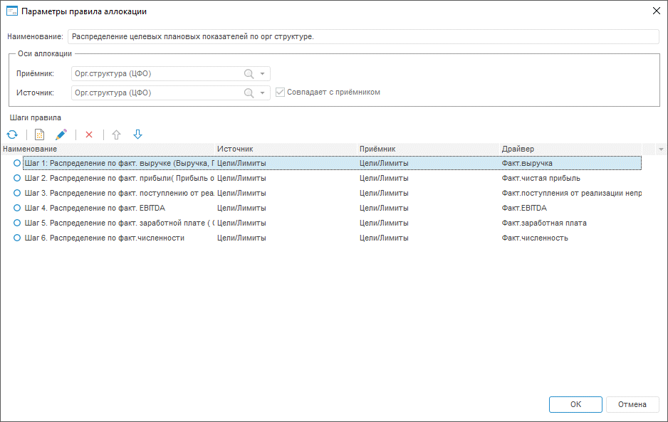 В результате создания шагов правил аллокации список шагов отображается в соответствующей области окна параметров правила аллокации. В списке шагов выводится наименование, источник, приёмник и драйвер аллокации шага.