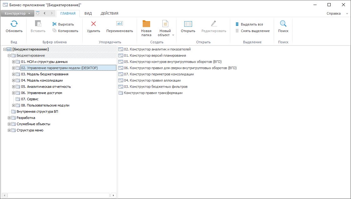 Навигатор объектов конструктора предоставляет функциональность для работы с объектами преднастроенной конфигурации программного продукта, а также возможности по созданию новых объектов, используемых в процессах бюджетирования.