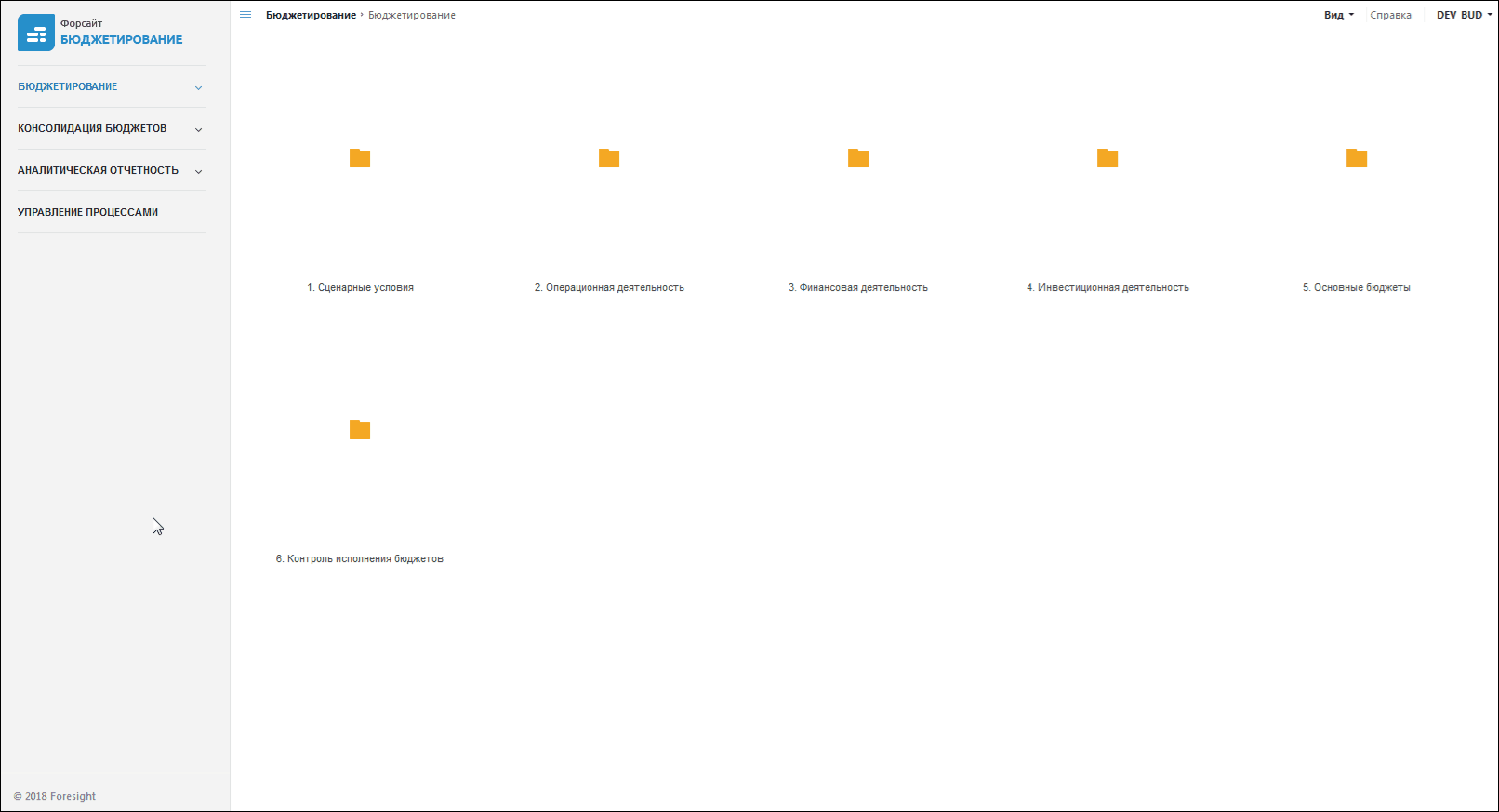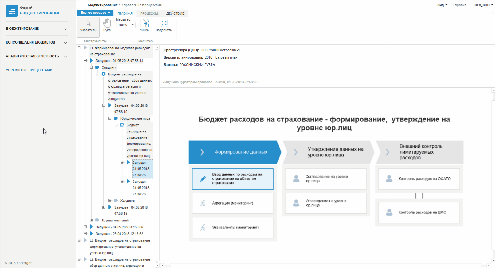 Откройте раздел «Управление процессами» в веб-приложении продукта «Форсайт. Бюджетирование» и выберите нужный процесc в дереве подпроцессов: