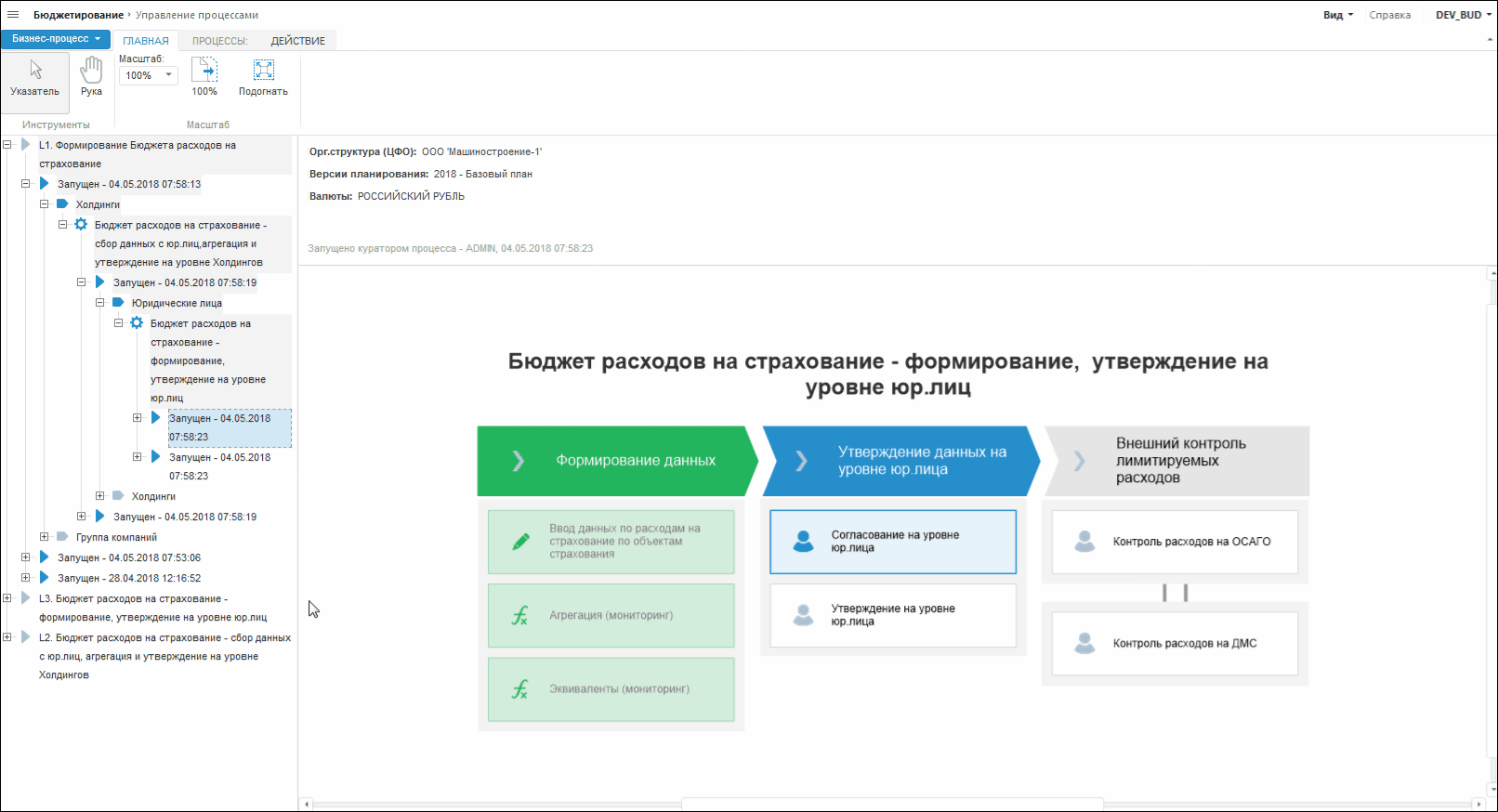 Запуск бюджетных процессов выполняется в настольном приложении. Процессы инициируются и запускаются по схеме «сверху-вниз»: на уровне группы компаний вызываются подпроцессы формирования данных в холдингах, а на уровне холдингов вызываются подпроцессы сбора и утверждения данных переменных коммерческих расходов на уровне юридических лиц.