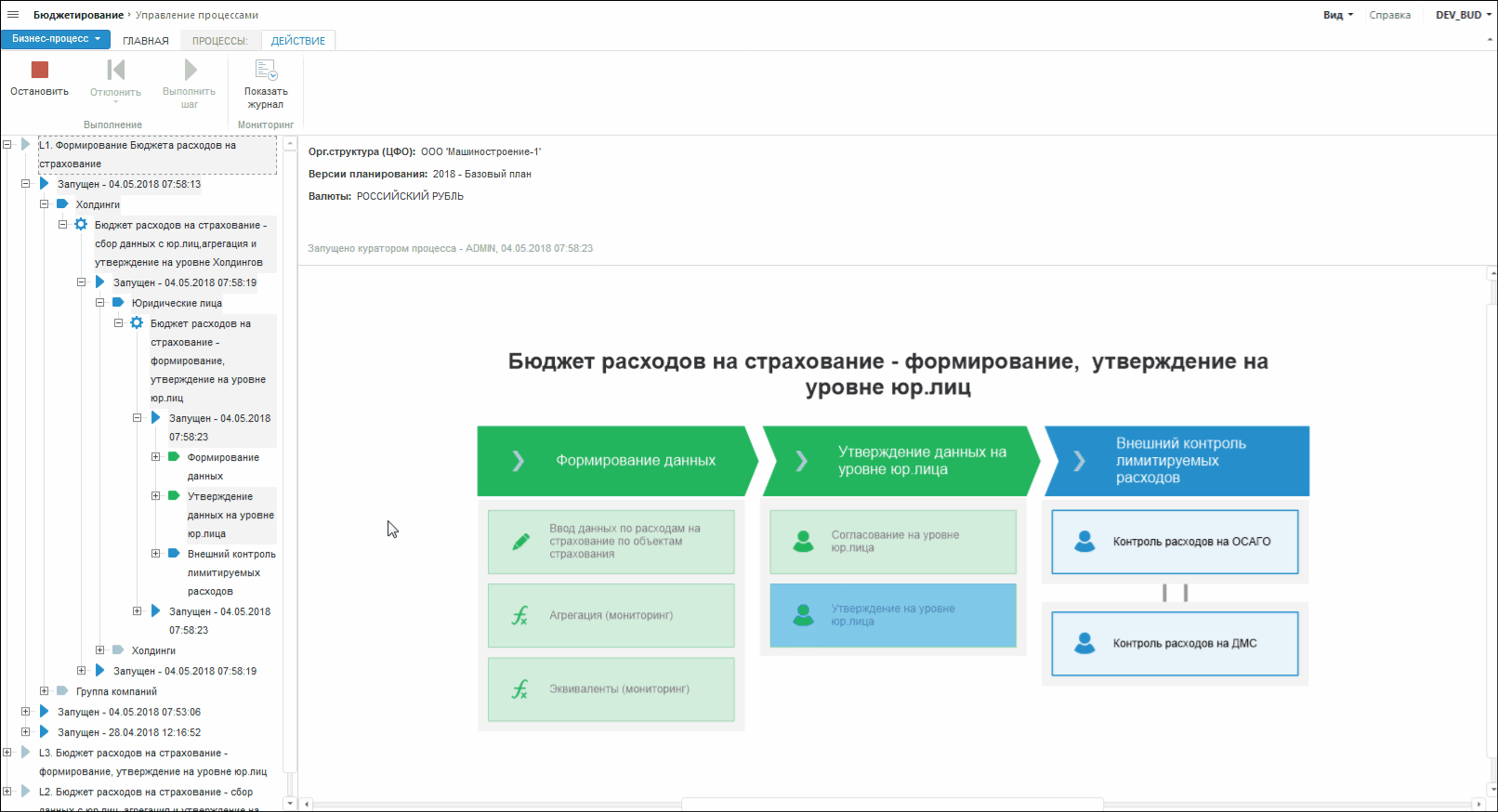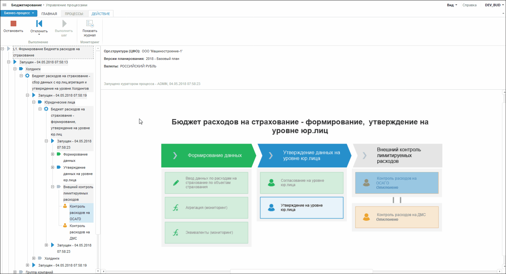 Для мониторинга выполнения бюджетных процессов используйте расширение «Мониторинг процесса», который позволяет выполнять шаги процесса и наглядно отображает состояние выполнения процесса.