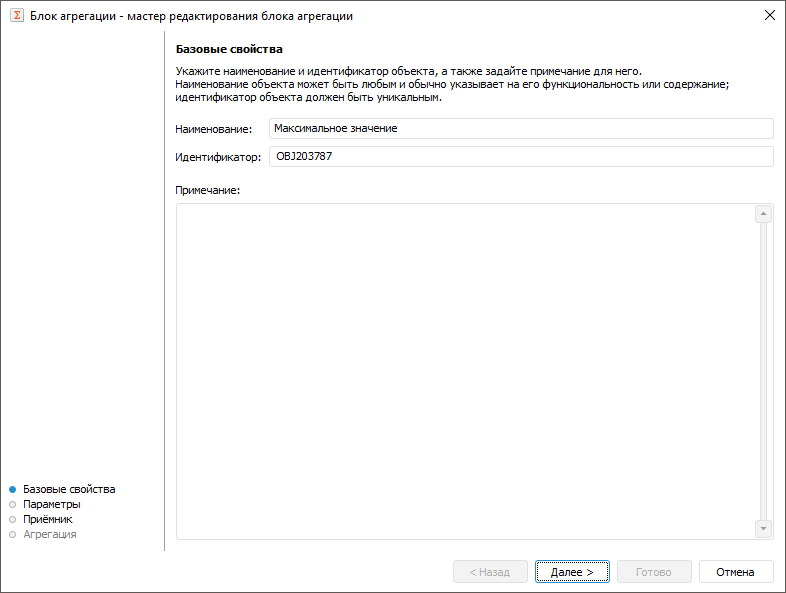 Настройка базовых свойств блока агрегации выполняется на странице «Базовые свойства» в мастере редактирования блока агрегации: