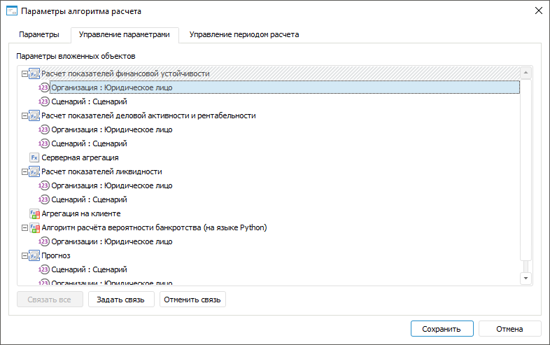 Задание связей параметров алгоритма расчёта с параметрами блоков выполняется на вкладке «Управление параметрами» в диалоге «Параметры алгоритма расчёта»: