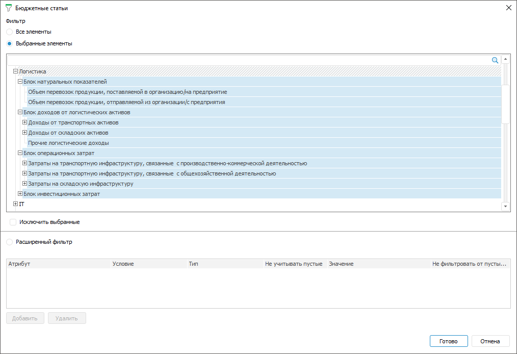 Выбранные элементы. Отметьте только нужные элементы или исключите выбранные элементы из отметки, установив флажок «Исключить выбранные». Для фиксированных измерений с отключенной агрегацией можно выбрать только один элемент и флажок «Исключить выбранные» недоступен.